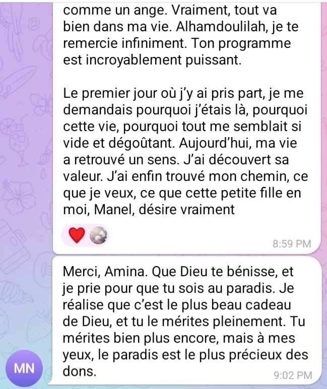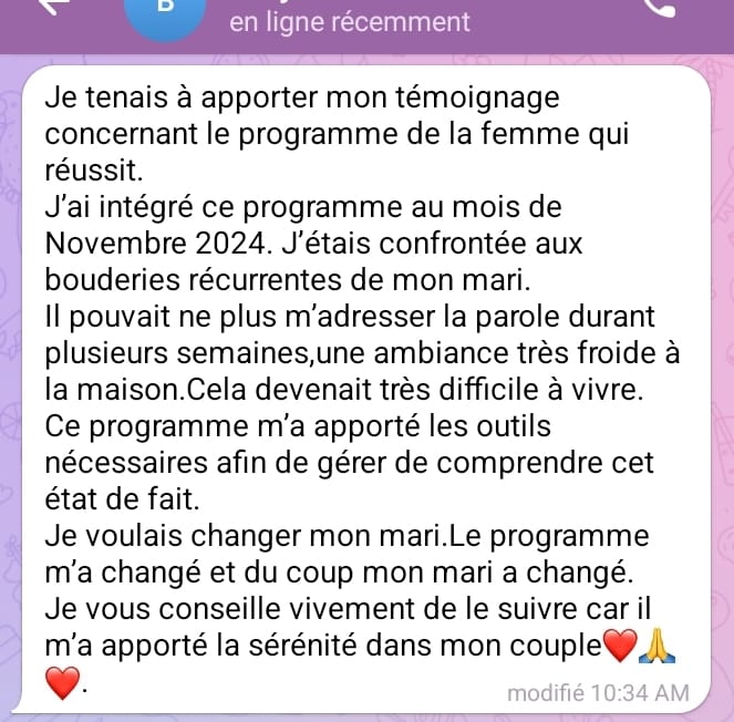 Ce programme n'est pas pour toi si : ⏳ **Tu cherches des résultats instantanés** et tu ne comprends pas qu'il y a un travail à faire ❌ **Tu n'es pas prête à t'engager sérieusement** pendant 40 jours et à suivre le programme avec régularité. 😱 **Tu juges trop vite** avant même de plonger dans les détails du programme. 👁️ **Tu ne veux pas accepter** que tu as une part de RESPONSABILITÉ dans ce qui t'arrive. 💼 **Tu es convaincue que c'est toujours la faute des autres** et des conditions extérieures. 📅 **Tu n'es pas sérieuse ** et tu ne veux faire aucun effort pour ton progrès. Dans ce cas, ce programme ne te conviendra pas !