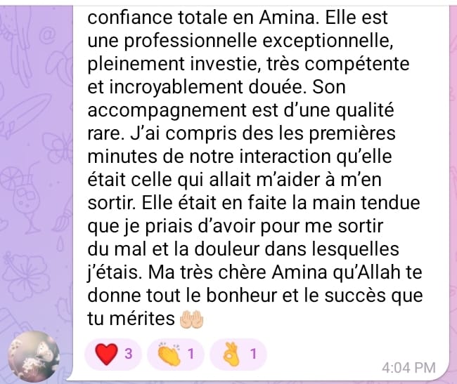 Amina, Psychopraticienne, ex Avocate - Ancienne directrice d'école Americaine International - Coach Int. certifié spécialisé en relations.